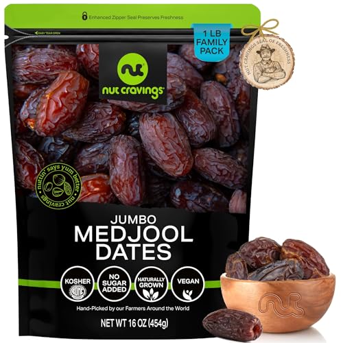NUT CRAVINGS - Sun Dried Jumbo Medjool Dates, No Sugar Added, Unsulphured (16oz, 1 LB) Bulk Dry Fruits Packed Fresh in Resealable Bag - Sweet Healthy Snack, Naturally Grown, Vegan, Kosher, 1 Pound (Pack of 1)