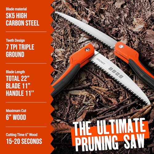 • GROWIT Folding saw 11 Inch - Heavy Duty Pruning Saw with Triple-Cut SK5 Blade, 7 TPI Razor Teeth for Tree Trimming, Wood Cutting, Camping, Bushcraft, and Gardening