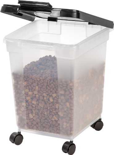 • IRIS USA 25 Lbs / 32.5 Qt WeatherPro Airtight Pet Food Storage Container with Removable Casters, for Dog Cat Bird and Other Pet Food Storage Bin, Keep Fresh, Translucent Body, Clear/Black