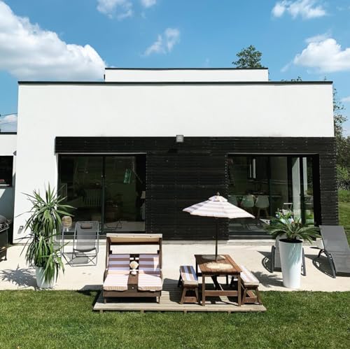 • KidKraft Outdoor Wooden Table & Bench Set with Cushions and Umbrella, Kids Backyard Furniture, Espresso with Oatmeal and White Stripe Fabric