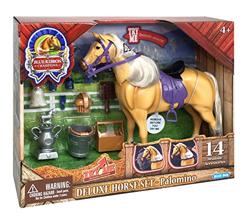 Sunny Days Entertainment Palomino Horse with Moveable Head, Realistic Sound and 14 Grooming Accessories - Blue Ribbon Champions Deluxe Toy Horses, Palamino, 14 Piece Set
