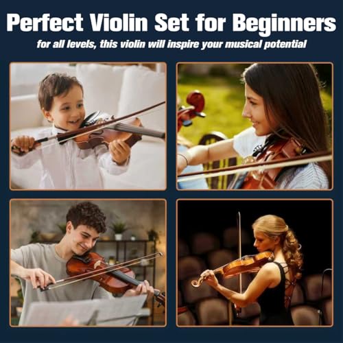 • Mendini By Cecilio Violin 4/4 Full Size For Beginners - Fiddle Solidwood Kit with Hard Case - Acoustic Violins with Bow, Rosin, Tuner, Extra Strings & Bridge, Shoulder Rest and Lesson Book (Varnish)
