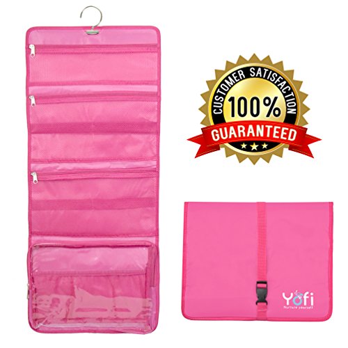 • Hanging Toiletry Bag by Yofi Nurture Yourself: Organizer for Cosmetics, Makeup, Jewelry, Toiletries, Shaving Tools in Pink Expandable, Polyester Case with Zippers and Sections for Home or Traveling