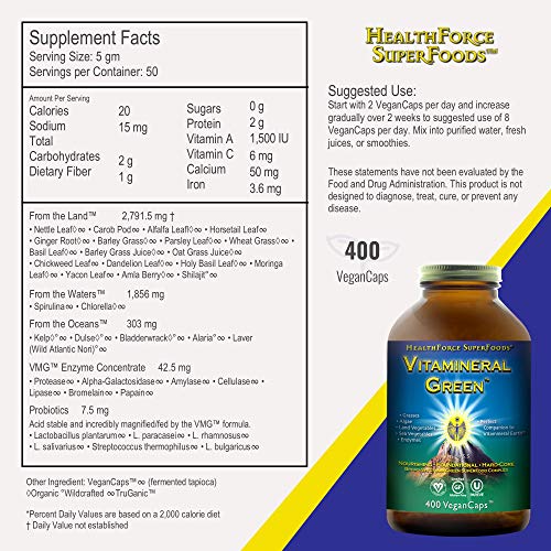 • HealthForce SuperFoods Vitamineral Green - 400 Vegan Capsules - All Natural Green Superfood Complex with Vitamins, Minerals, Amino Acids & Protein - Vegan, Gluten Free - 50 Servings