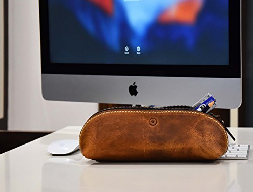• Vintage Leather Zippered Pen/Pencil Case | Classic Cylindrical Design Craft/Art Supplies Storing Kit | Portable Travel Cosmetics Makeup Pouch By Aaron Leather (Tan)
