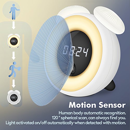 • Kid's Alarm Clock, Smart Night Light Digital Desk Clocks Wake Up Clock with Timer, Adjustable LED Brightness Motion Sensor Modern Travel Alarm Clock for Heavy Sleepers