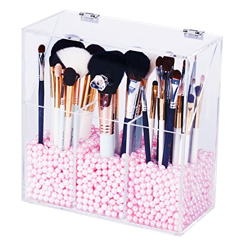 • Newslly Clear Acrylic Makeup Organizer with 3 Brush Holder Compartment and Dustproof Lid, Cosmetic Brush Storage Box with Pink Pearls, for Bathroom Bedroom Vanity Countertop