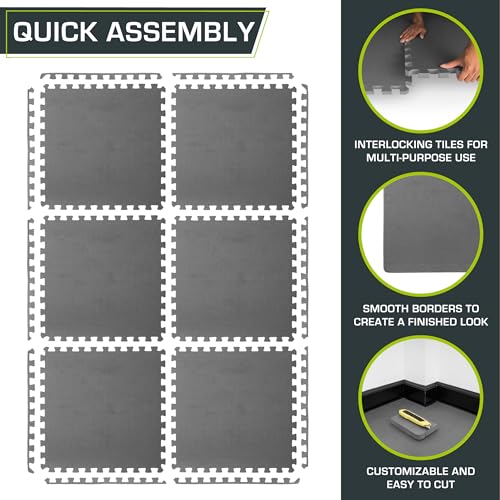 Transform any space into a comfortable workout area with the Resource Exercise Puzzle Mat ¾”. Six extra-thick tiles create protective flooring over wood, concrete or carpet for workouts and gym equipment. This is the perfect solution for anyone looking for an exercise mat or multipurpose flooring thicker than ½” thick, with greater durability and ability to handle heavy weight and high traffic. The textured surface has a soft feel with non-skid traction that is low-maintenance. Interlocking pieces are easy to assemble, covering 24 square feet. 12 border pieces help to create a flawless finish. Built to absorb impact and provide cushion to sensitive joints while reducing noise. EVA foam contains no toxic phthalates. Use just a few tiles for smaller spaces, or purchase multi-plea sets for large areas. Perfect for fitness studios, home gyms, commercial use, children's play areas, gymnastics or wrestling practice, yoga and more!