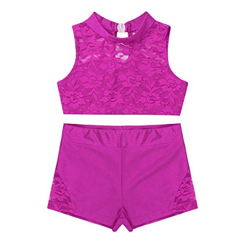 • MSemis Girls' Kids 2-Piece Active Set Dance Sport Outfits Racer Back Top and Booty Short Gymnastics Dancing Clothes Rose_Red Lace 5-6