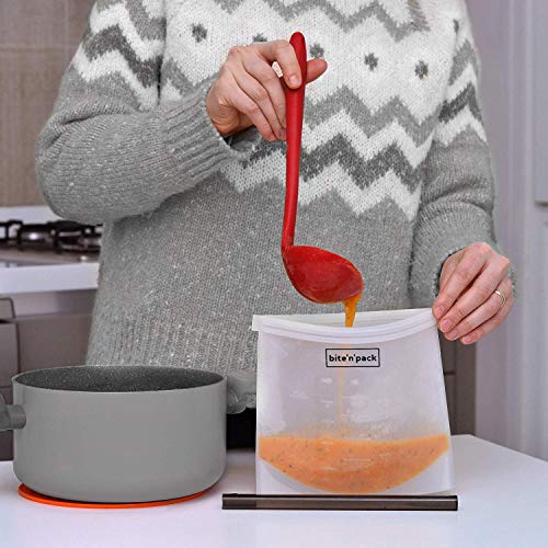 • Reusable Silicone Food Storage Bag Set of 4 + 1 BONUS LADLE to Store/Freeze/Heat/Sous Vide Food and Drinks, Leakproof, Microwave Freezer Dishwasher Safe, Reusable Sandwich Bags