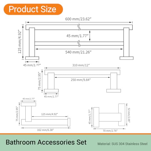 • Hoooh 4-Piece Bathroom Accessories Set Brushed Stainless Steel Wall Mount - Includes Double Towel Bar, Hand Towel Rack, Toilet Paper Holder, Robe Hooks, BS101S4-BN
