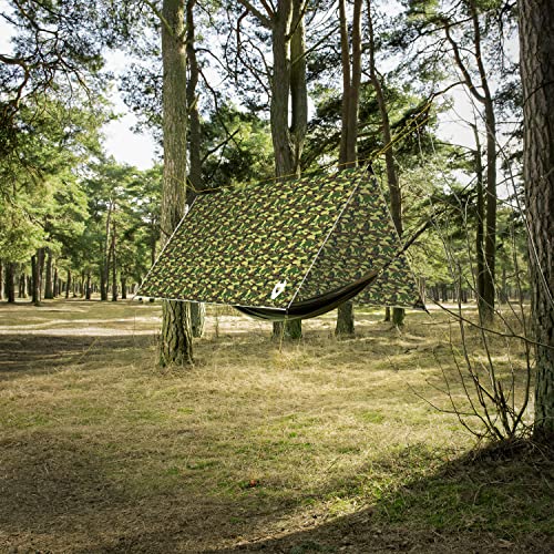 • Rain Fly by NoCry 10x10 Lightweight Survival Camping Tarp; 100% Waterproof; Makes a Great Backpacking Tarp or Hammock Shelter; Comes in Multiple Colors, Survival Bracelet Included; Camo