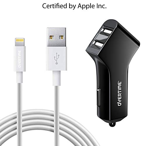 overtime Apple MFI Certified Dual USB iPhone Car Charger Adapter and Lightning Cable 4FT - 2.4 Amp Car Charger Kit with Rapid Charge Apple Lightning to USB Cable for iOS iPhone 8/+/X iPad Pro iPod - Black, Black Charger & Cable