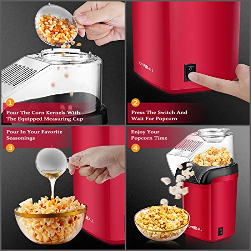 Popcorn Maker, Oneisall 1200W Fast Popcorn Machine, Hot Air Popcorn Popper with Wide Mouth Design, Oil-Free, Including Measuring Cup and Removable Lid, FDA Approved, Red