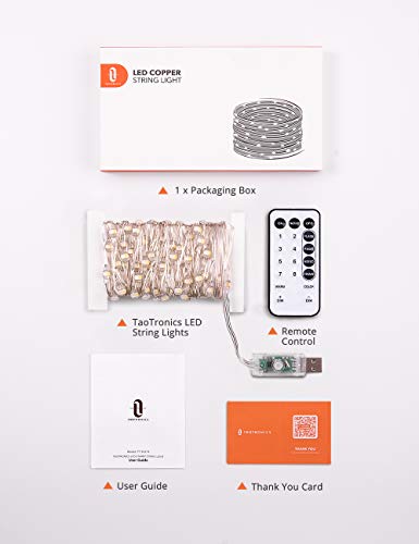 • TaoTronics LED String Lights,33ft 100 LEDs USB Powered Dimmable Copper Fairy String Lights,Warm White & 4 RGB Colors,16 Lighting Modes, Remote Control,IP65,Decorative Lights for DIY bedroom,Patio,Yard