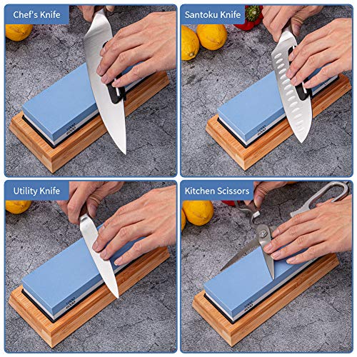 • SKY LIGHT Knife Sharpening Stone, Safe Knife Sharpening Set, Whetstone 2 Side Grit 1000/6000 Waterstone, Straight & Serrated Kitchen Knife Sharpener Kit with Nonslip Bamboo Base & Angle Guide