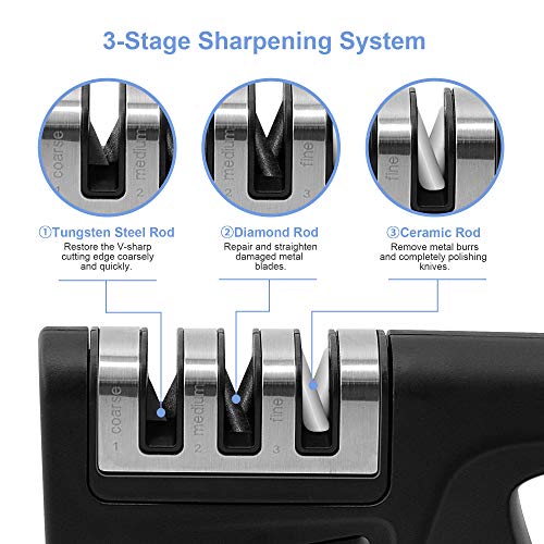 • ONECOOK Manual Kitchen Knife Sharpener 3 Stage, Professional 4 in 1 Knife Sharpening with Scissors Sharpening Slot, Black