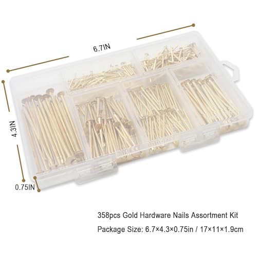 JEGONFRI 6 Sizes Gold Hardware Nails Assortment Kit, 358pcs, Brass Plated, Nails for Hanging Pictures, Finishing Nails, Wood Nails, Wall Nails for Hanging (3”, 2”, 1-1/2”, 1-1/4", 1”, 3/4")