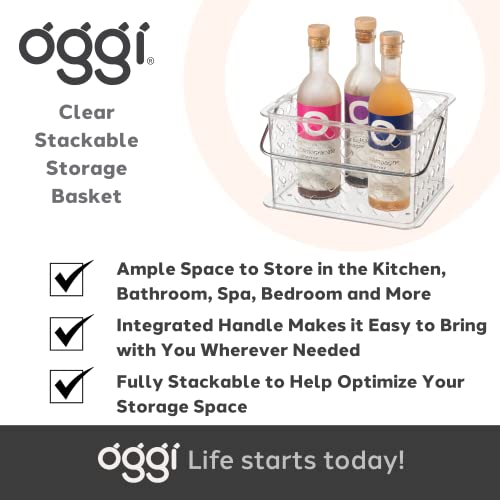 • OGGI Clear Stacking Storage Basket with Handle - Plastic Caddy with Handle, Ideal Kitchen Undershelf Basket, Bathroom Storage Bin, Beauty Product Organizer, Cleaning Basket, Makeup Caddy, Size 9x7x5"