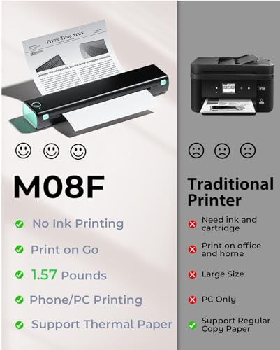 • Phomemo Portable Printers Wireless for Travel, M08F Inkless Thermal Printer Support for 8.5"x11" US Letter, Small Bluetooth Printer Compatible with Phone, Laptop for Car, Office, Home Use, School