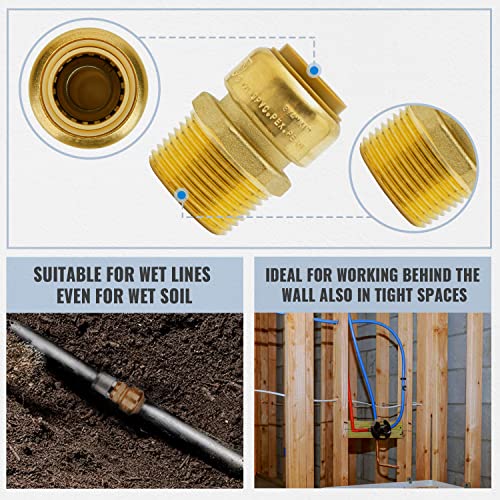 • SUNGATOR 3/4 Inch x 1 Inch Male NPT Adapter, No Lead Brass Push-to-Connect Plumbing Fittings to Connect PEX, Copper, CPVC, With A Disconnect Clip and A Sealing Tape, Pack of 6