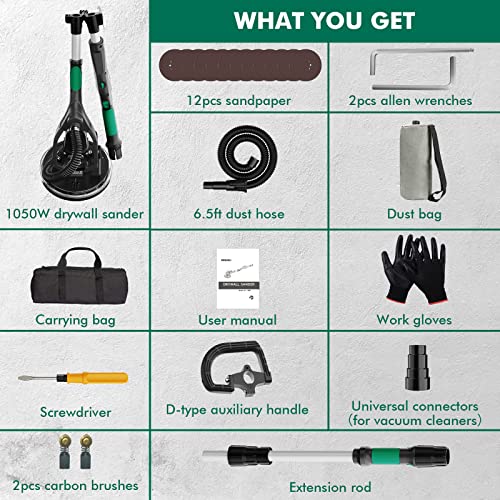 • Electric Drywall Sander with Vacuum Dust Collector, IMQUALI® 9.5A 1050W Floor Sanders for Wood Floor with Variable Speed 600-2600RPM, Extendable Handle, LED Light, 12pcs Sanding Discs, Green, IM03