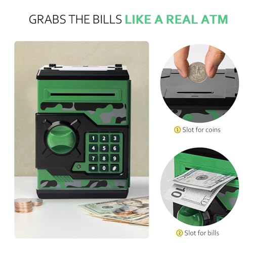 • ATM Piggy Bank for Boys Girls, Vcertcpl Mini ATM Coin Bank Money Saving Box with Password, Kids Safe Money Jar for Adults with Auto Grab Bill Slot, Great Gift Toy Bank for Kids (Camouflage GreenGray)