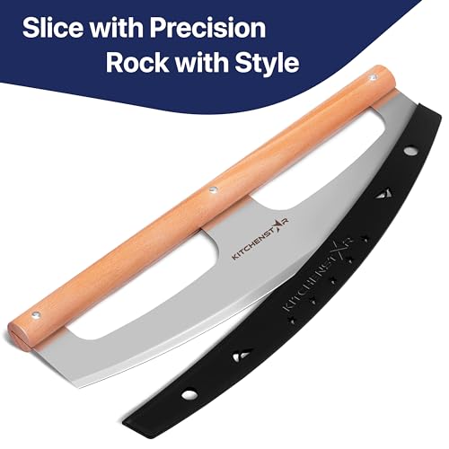 KitchenStar 16-Inch Pizza Cutter Rocker Blade - Razor Sharp Stainless Steel Slicer Knife, Stylish Beech Wood Handle, Protective Cover - Professional Pizza Oven Accessories, Silver, a) Silver, 16 inch