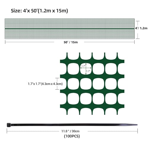 • Ohuhu Garden Fence Animal Barrier: 4x50 FT Reusable Netting Plastic Safety Fence Roll with Zip Ties, Temporary Pool Fence Snow Fence Construction Fencing for Poultry Deer Rabbits Chicken Dogs, Green