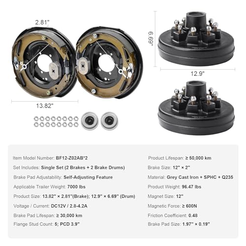 • VEVOR Trailer Hub Drum Kits 8 on 6.5" B.C. with 12" x 2" Electric Brakes, Self-Adjusting Trailer Brake Assembly for 7000 lbs Axle, 5-Hole Mounting, Backing Plates for Brake System Part Replacement