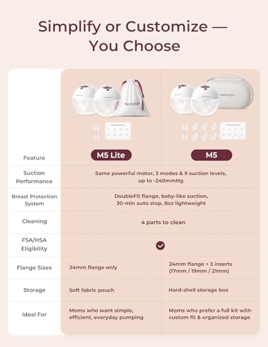 • Momcozy M5 Lite Hands-Free Wearable Breast Pump, DoubleFit Flange for Baby-Like Comfort, 3 Modes & 9 Suction Levels, No Flange Insert or Hard Carry Case, 24mm, 2-Pack, Cozy Red