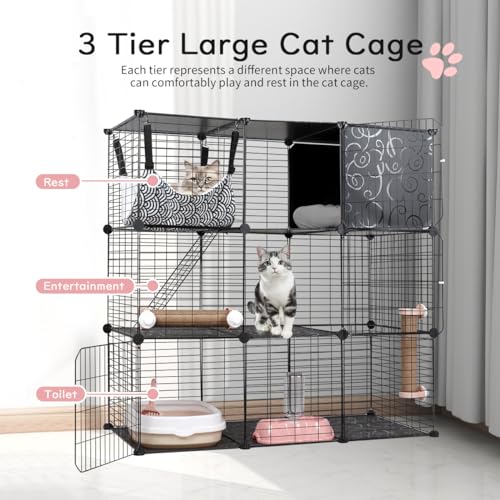BriSunshine Cat Cages Indoor, 3 Tier DIY Cat Enclosure with Large Hammock, Metal Wire Pet House Kennels Crate Catio with Litter Box, Bed, Scratchers, Bowl, Stairs for 1-2 Cats, 3 Tier - Black, 42.7"L x 18.3"W x 43.0"H