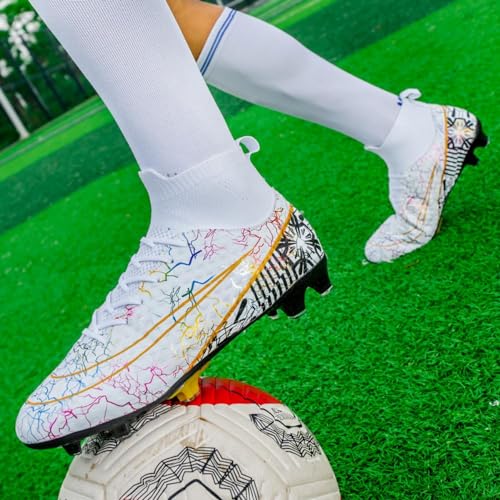 • FAHOT Soccer Shoes Men's Women's Non-Slip High Top Spikes Outdoor Indoor Boys Girls Professional Football Training Sneakers (White, Adult, Men, 10, Numeric, US Footwear Size System, Medium)