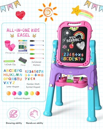 • Lehoo Castle Easel for Kids, 4 in 1 Double Sided Kids Art Easel with Magnetic White Board & Chalk Board, Adjustable Standing Toddler Easel with Drawing & Writing Accessories (Blue, Purple, Pink)