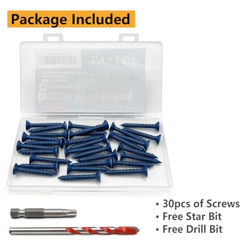 • Allkeen 1/4" x 1-3/4" Concrete Screws, Anchoring to Masonry, Brick, Block, Cement or Stucco, 30PCS