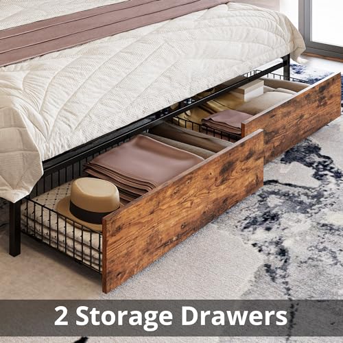 LIKIMIO King Size Bed Frame, Storage Headboard with Charging Station, Platform Bed with Drawers, No Box Spring Needed, Easy Assembly, Vintage Brown and Black