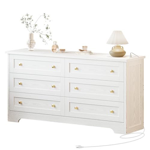 • LIKIMIO 59" Dresser for Bedroom, 6 Drawer Dressers with Charging Station, White Dresser for 65" TV, Long Dresser for Closet, Bedroom, Hallway