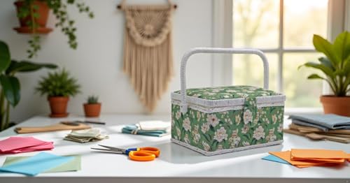 • Sewing Basket with Sewing Kit Accessories, Sewing Basket Organizer for Adults, Beginners, Medium, Green White Flower