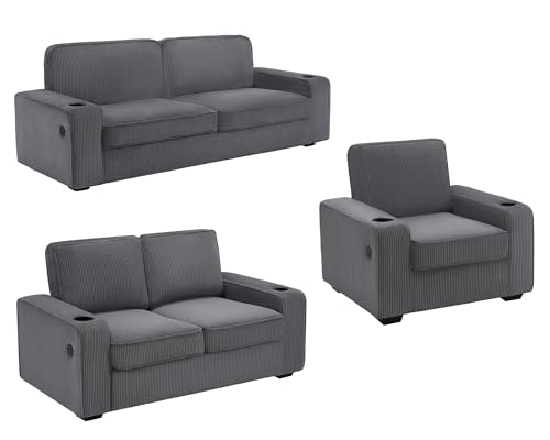 VanAcc Sofa, 3 Piece Set, Deep Seat Couches with Cup Holders & USB Charging Ports, Modern Couches- Comfy Sofas for Living Room(Ash Grey Corduroy), 89''+58''+37''