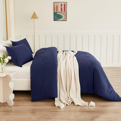 • Litanika Navy Blue Comforters Oversized King Size, 3 Pieces Lightweight Solid Bedding Comforter Set, All Season Fluffy Bed Set (120x98In Comforter & 2 Pillowcases)