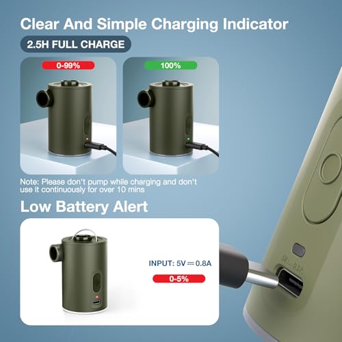 RTLOII Portable Air Pump for Inflatables, Ultra-Mini Air Mattress Pump 4X with 1600mAh Battery & Camping Light, USB Rechargeable Air Pump for Swimming Rings, Pool Floats, Sleeping Pads, Vacuum Storage Bags, Green, 2.02"L x 2.28"W x 3.26"H