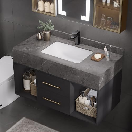 • homary 35.4" Bathroom Vanity Set, Modern Wall-Mounted Vanity Bathroom Floating Medicine Cabinet with Sintered Stone Countertop, Undermount Sink & Black, 2 Open Storage Shelves