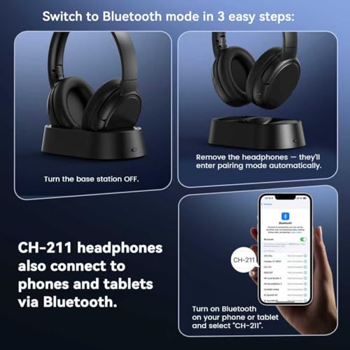Swiitech Wireless Headphones for TV Watching, TV Headphones with Transmitter Charging Base, Bluetooth V5.3, No Lip-Sync Delay, Clear Voice, Plug & Play, Comfortable, Gifts for Elderly/Seniors, Black, Ensemble Item Sku: