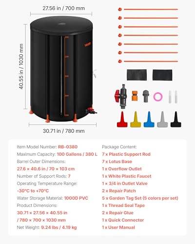 • VEVOR Collapsible Rain Barrel, 100 Gallon Portable Rain Water Collection Barrel, 1000D PVC Rainwater Collection System, Garden Water Catcher Tank Storage Container with Spigot & Overflow Kit, Black