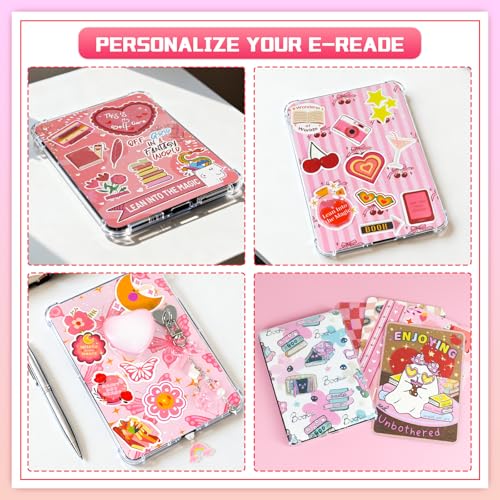 MUOUAKATE Cute E-reader Accessories Set, 12Pcs Insert for Clear Case, 50pcs Scrapbook Stickers, Dust Plug Charm Type C, Grip Holder, Charm Chain with Hook, Compatible for Kindle Paperwhite 11th 12th, pink, 6.9 x 4.8 inches