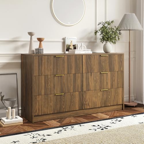 • Sscaktu 3-Piece Modern Bedroom Furniture Set, Wide 6-Drawer Dresser & 1-Drawer Nightstands Set of 2, Natural Wood Dresser and Nightstand Sets for Bedroom, Hallway, Walnut