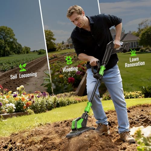 • 20V Cordless Tiller Cultivator, Lightweight 360RPM Electric Garden Tiller with 2 * 2.0Ah Batteries, 9" Width, 6.6" Depth, 48 Steel Tines Mini Rototiller for Weeding, Gardening & Soil Cultivation Green