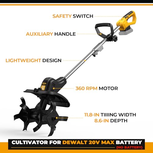 • Cordless Tiller Cultivator for Dewalt 20v Max Battery, 360RPM Electric Tiller for Gardening, 11.8in Tilling Width & 8.6in Depth, Battery Powered Tiller for Lawn/Soil Cultivation (Battery Not Included)