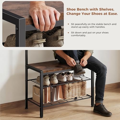 • DUMOS Hall Tree with Shoe Bench and Coat Rack, Entryway Bench with Shoe Storage and Hooks, 4-in-1 Coat and Shoe Rack for Entryway, Mudroom Storage Organizer with Shelves, Rustic Brown