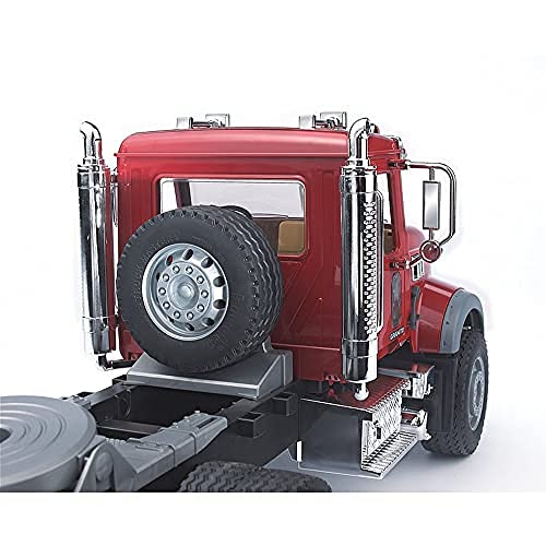 Load the backhoe onto this brand-new Mack truck and move to the next job. Truck and detachable trailer feature fifth wheel clutch, removable side gates, fold-down ramps held by chains to unhook, folding mirrors, opening doors, a folding support bar, a locking device and a tilting cab with viewable engine underneath. The included JCB Backhoe Loader has a fully-functional front loader and backhoe that moves up and down and swings side to side. It features stabilizer legs and a seat that spins around.